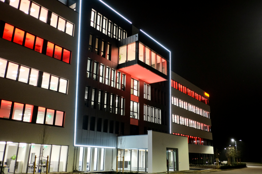 livebau hat erfolgreich die technische Umsetzung der Außenbeleuchtung des neuen Hauptgebäudes von Osram Opto Semiconductors in Regensburg übernommen.